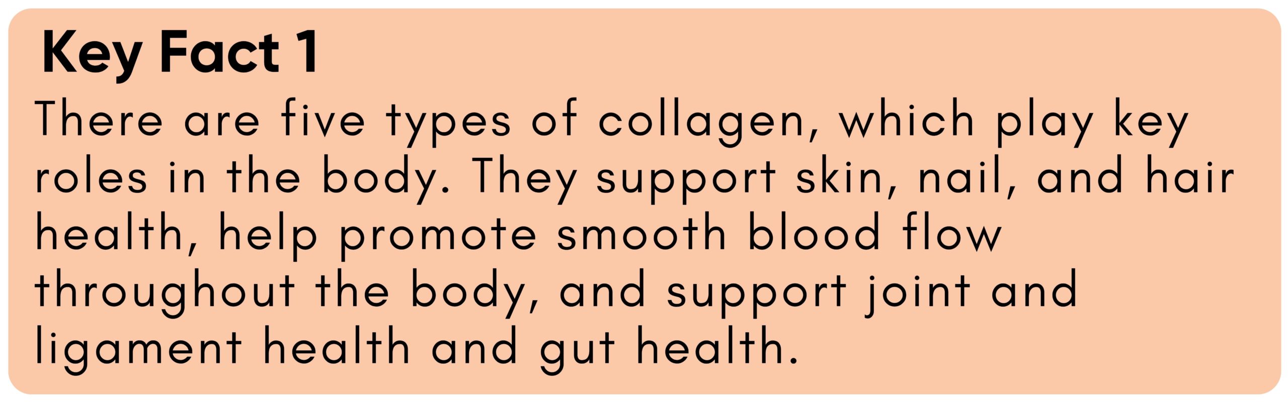 2. Five main types of collagen support your skin, hair, nails, joints, connective tissues, blood vessels, and gut. Together, they help maintain the structure and strength your body needs during pregnancy and beyond.