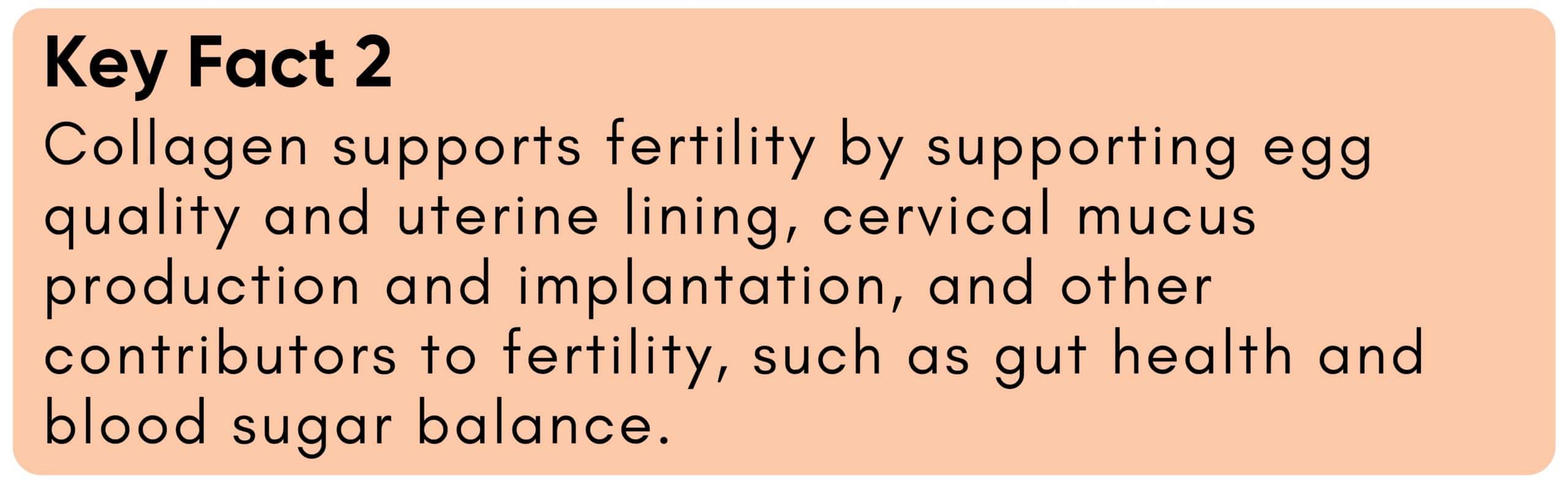 3. For fertility, collagen supports egg quality, uterine lining health, cervical mucus production, and implantation, promoting gut health and blood sugar balance. During pregnancy, it contributes to fetal development, supports your growing protein needs, promotes skin elasticity, and helps protect your joints and ligaments.