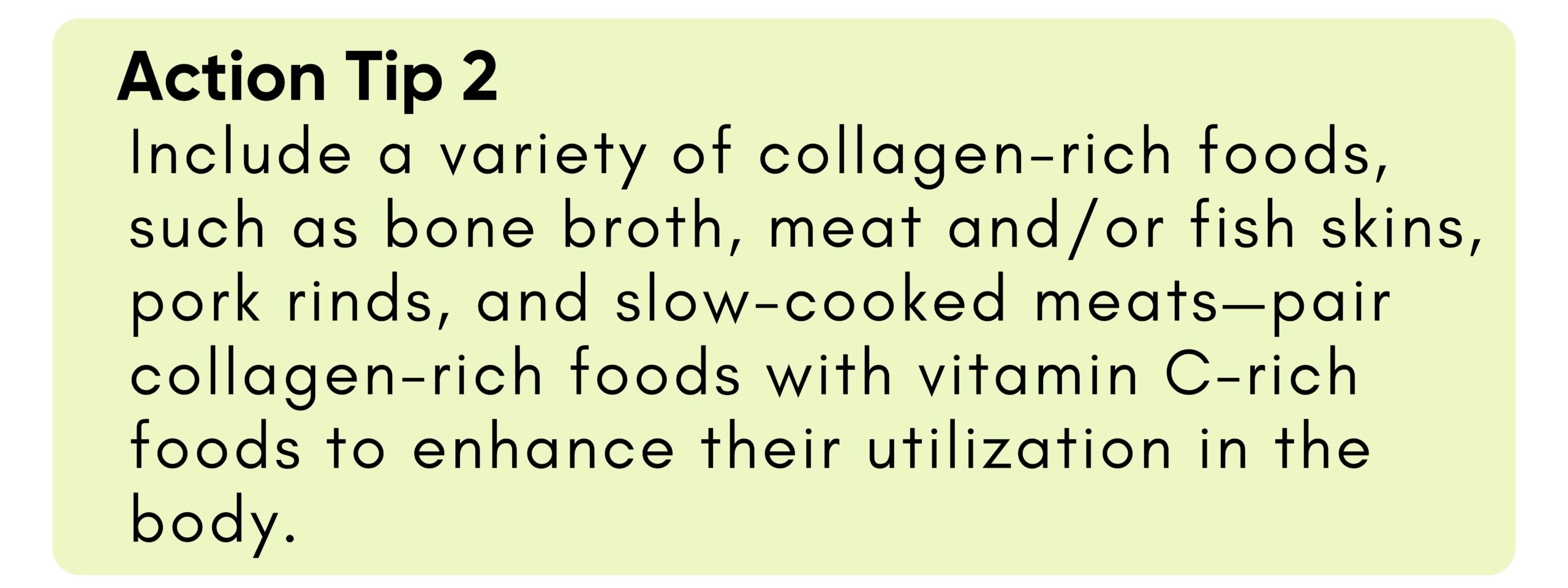 4. You can boost your collagen intake by eating foods naturally rich in it—like bone broth, fish or chicken skin, pork rinds, and slow-cooked meats—and pairing them with vitamin C–rich foods such as citrus and broccoli to enhance absorption.