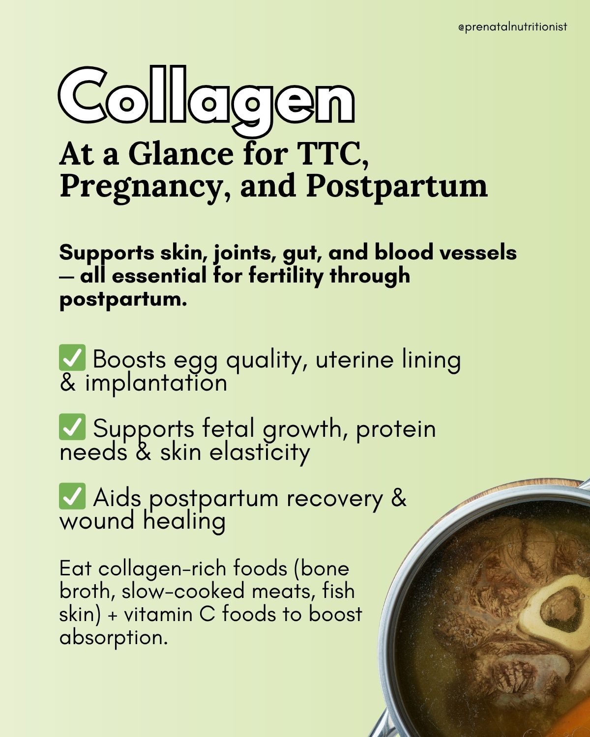 Collagen-rich foods, bone broth, and slow-cooked meats also provide other key nutrients for pregnancy, especially protein, zinc, and iron. Prioritizing these foods helps you meet your increased nutrient needs during pregnancy and postpartum in a more complete, bioavailable way.