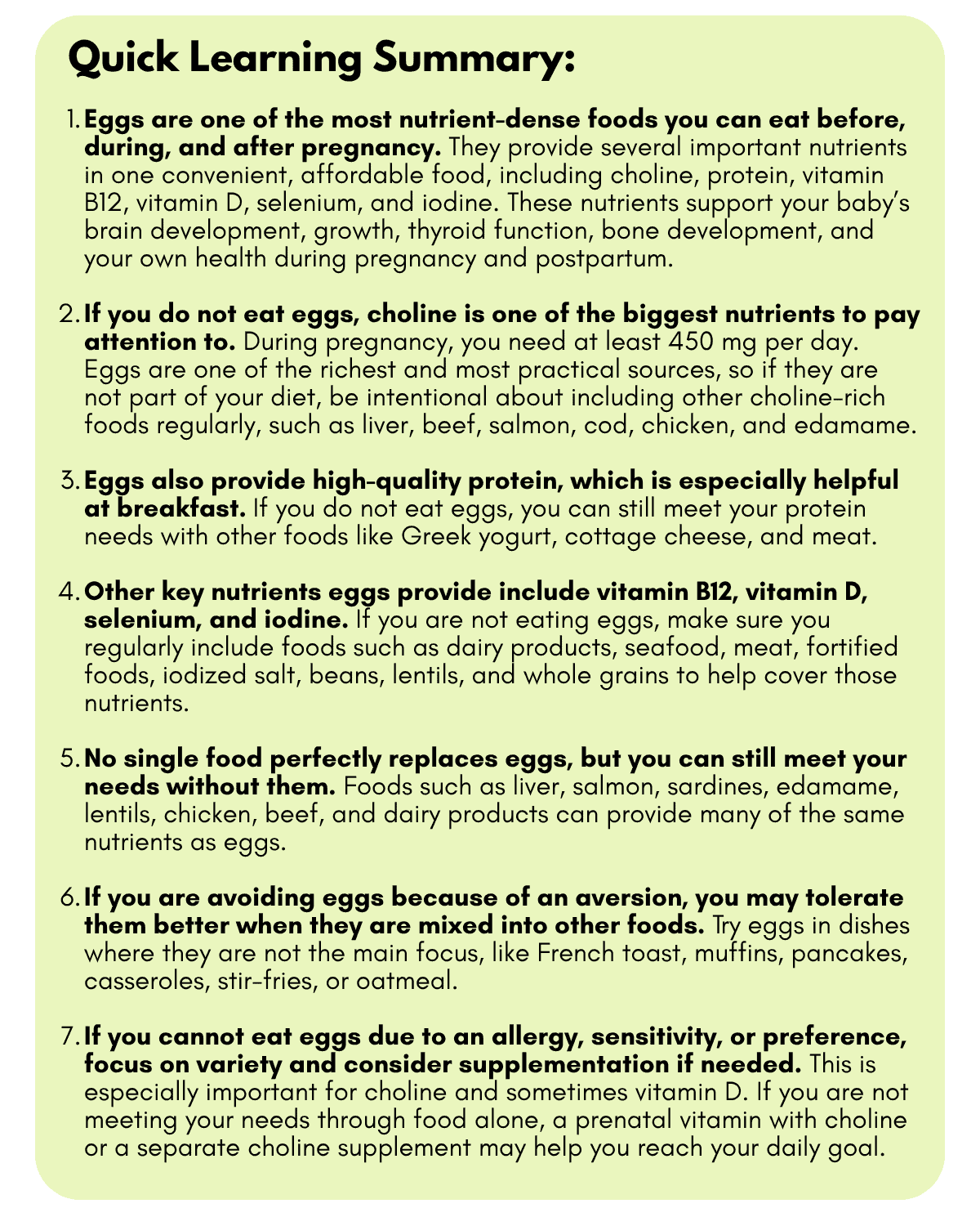 Eggs are one of the best sources of choline, a nutrient essential for fetal brain and nervous system development (1). Just like folate, choline helps prevent birth defects (2). It is also important for maternal liver and placental function during pregnancy (2).