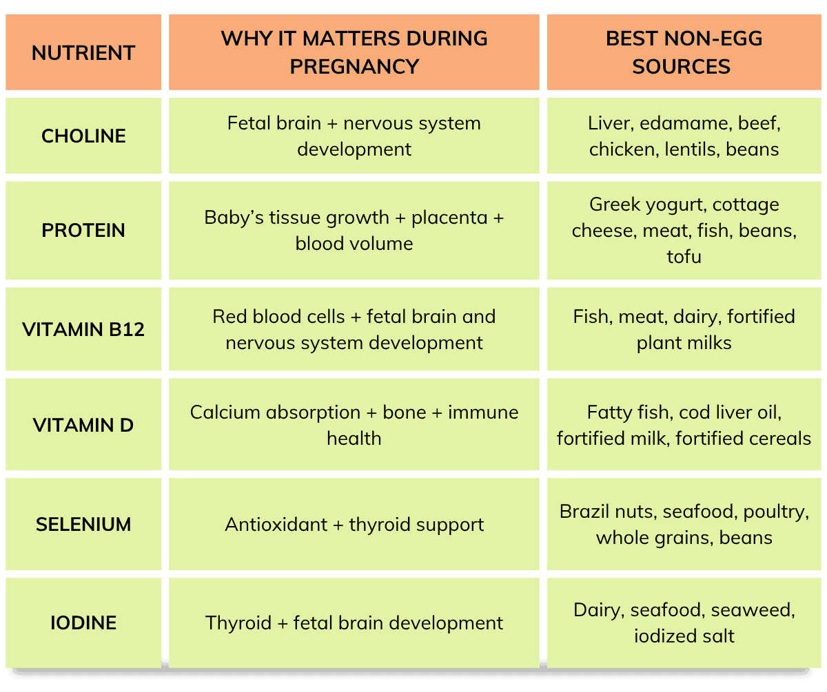 Eggs contain about 40-45 IU of vitamin D per egg, mostly in the yolk, which makes them one of the few naturally occurring food sources (6). Vitamin D supports calcium absorption, immune function, and bone development for both you and your baby (7). Eggs provide a small amount of vitamin D, but they are not the only source.
