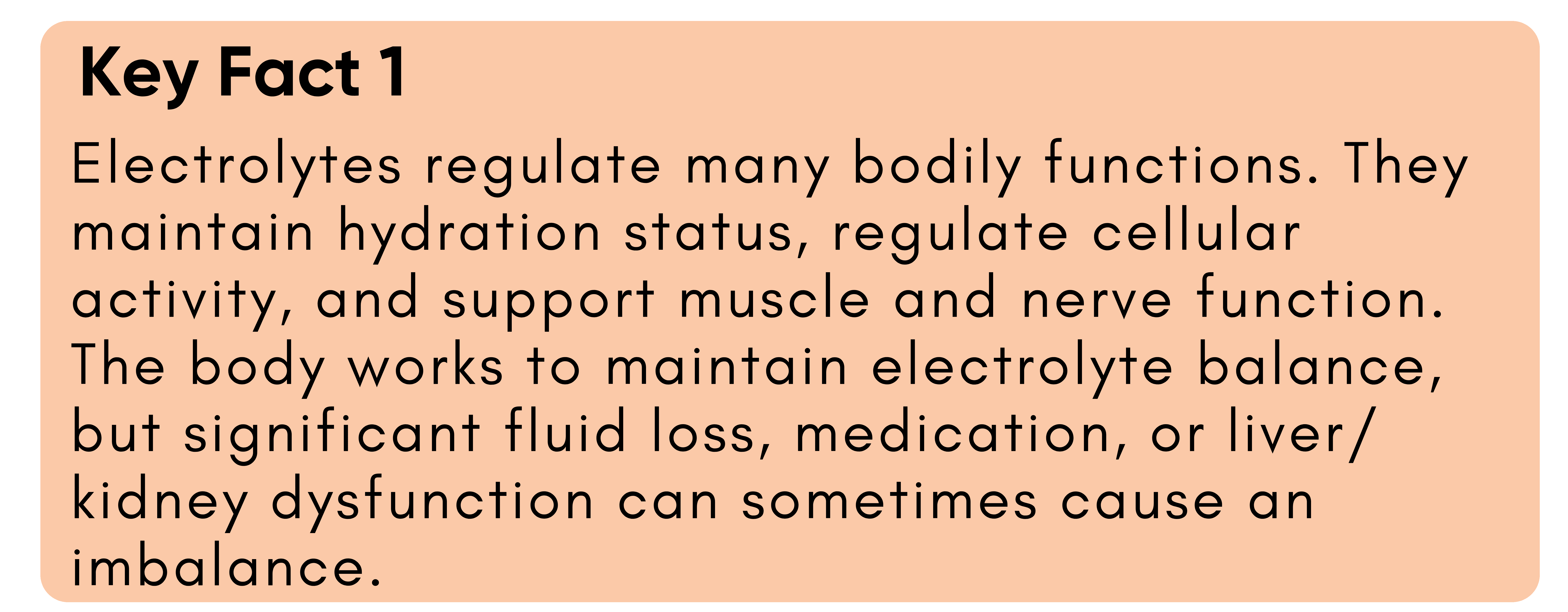 1. Electrolytes are charged minerals that keep your body functioning. They regulate hydration, pH, nerve and muscle activity, and nutrient transport. During the perinatal journey, your electrolyte needs shift as blood volume, hormone levels, and fluid balance change.