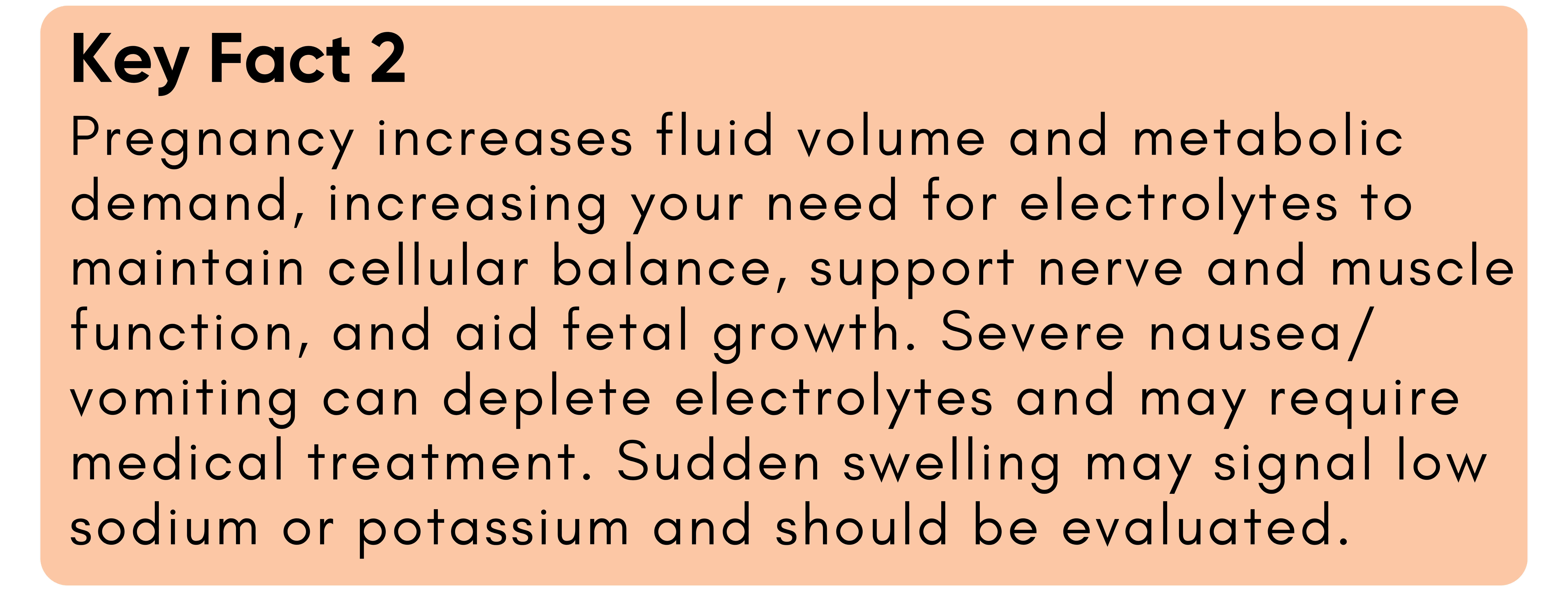 Your electrolyte needs shift slightly throughout the perinatal journey because your fluid balance, blood volume, and hormone activity change. Let’s break it down.