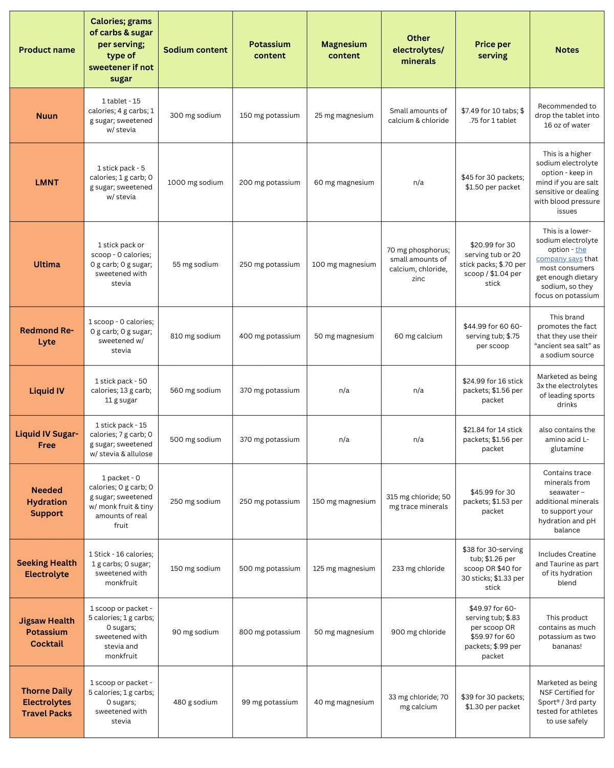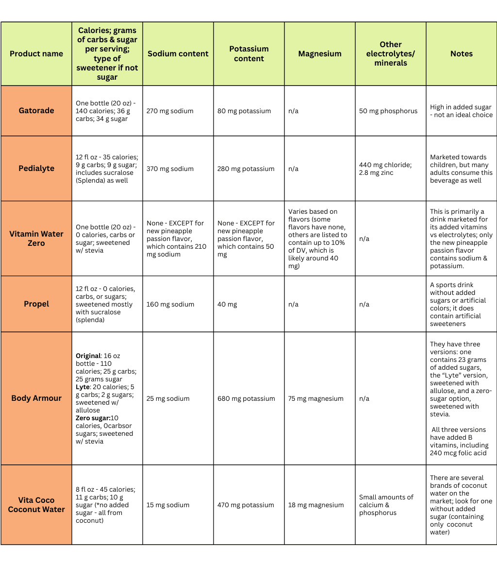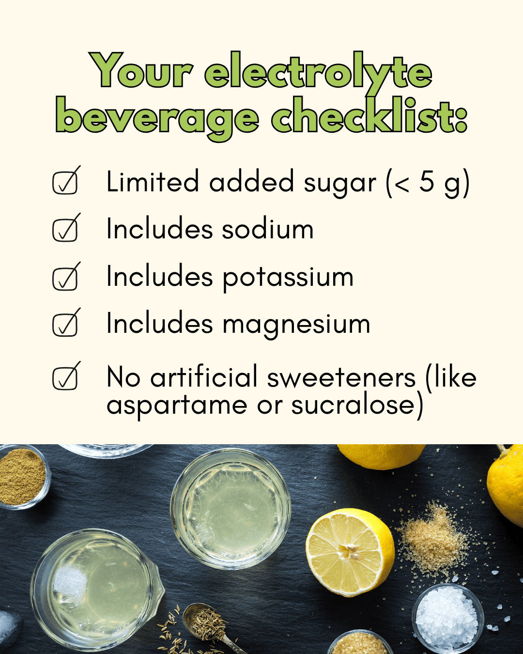 6. If you use an electrolyte supplement or beverage, choose one with limited added sugar, no artificial sweeteners, and sodium, potassium, and magnesium included. If you have the time, try making your own electrolyte beverage! You will likely save money and can customize the ingredients.