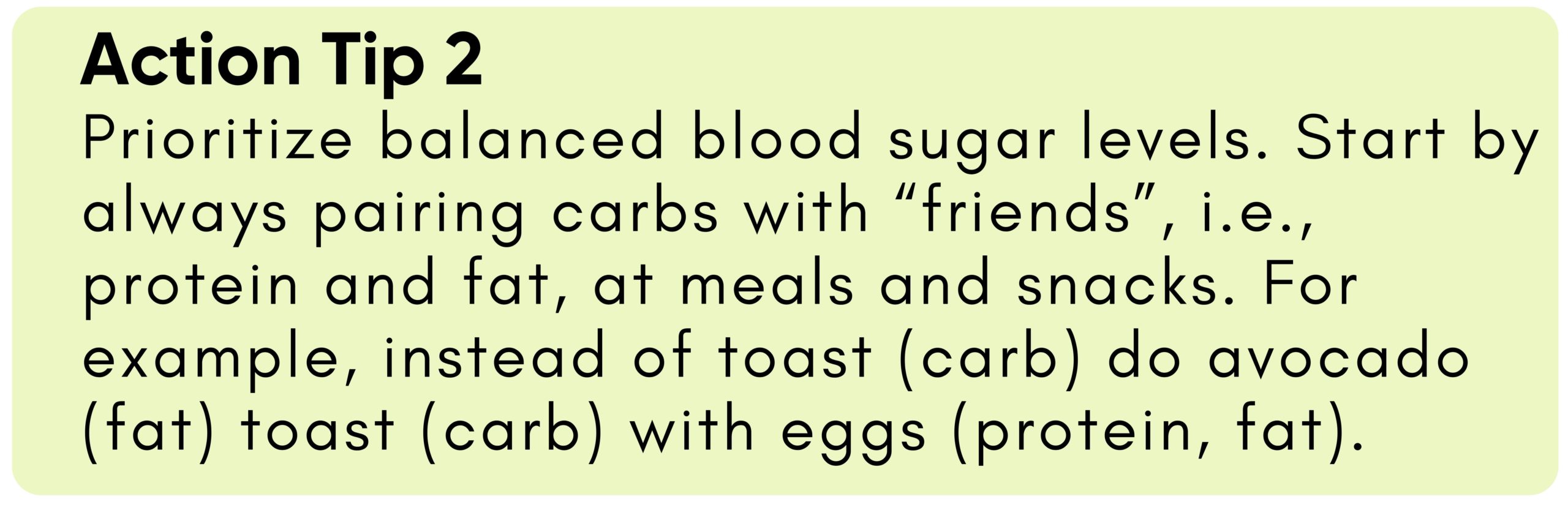 - Avoid “lonely carbs” (i.e., carbs without protein and/or fat)