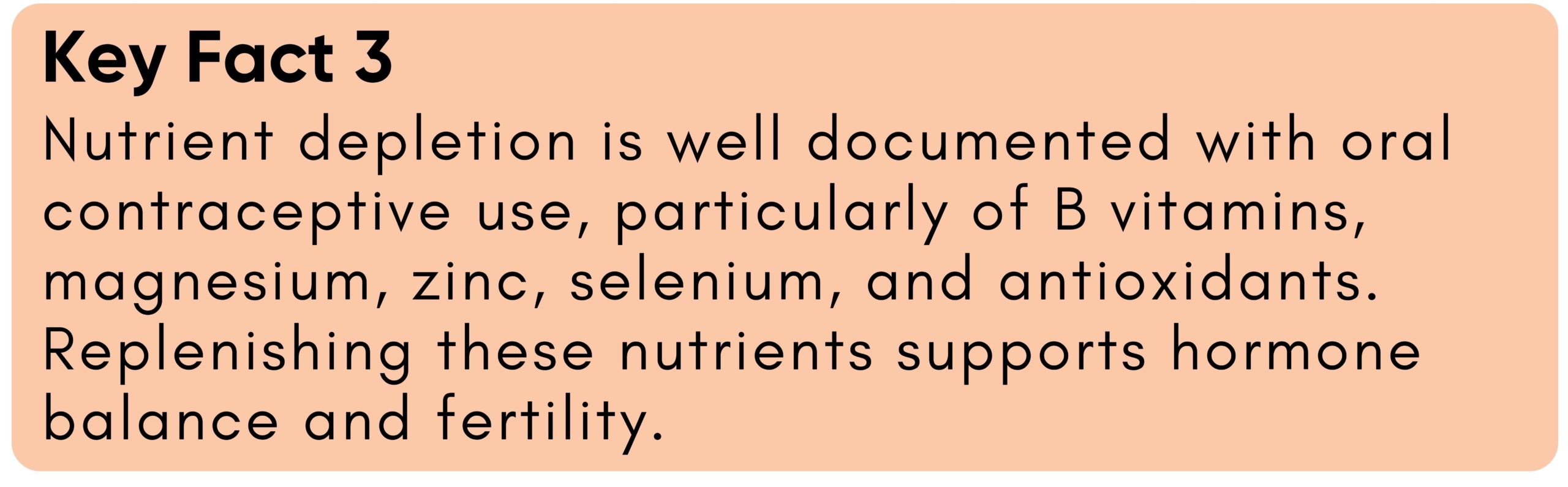 - Nutrient depletion is well documented with oral contraceptive use, particularly of B vitamins, magnesium, zinc, selenium, and antioxidants. Replenishing these nutrients supports hormone balance and fertility.