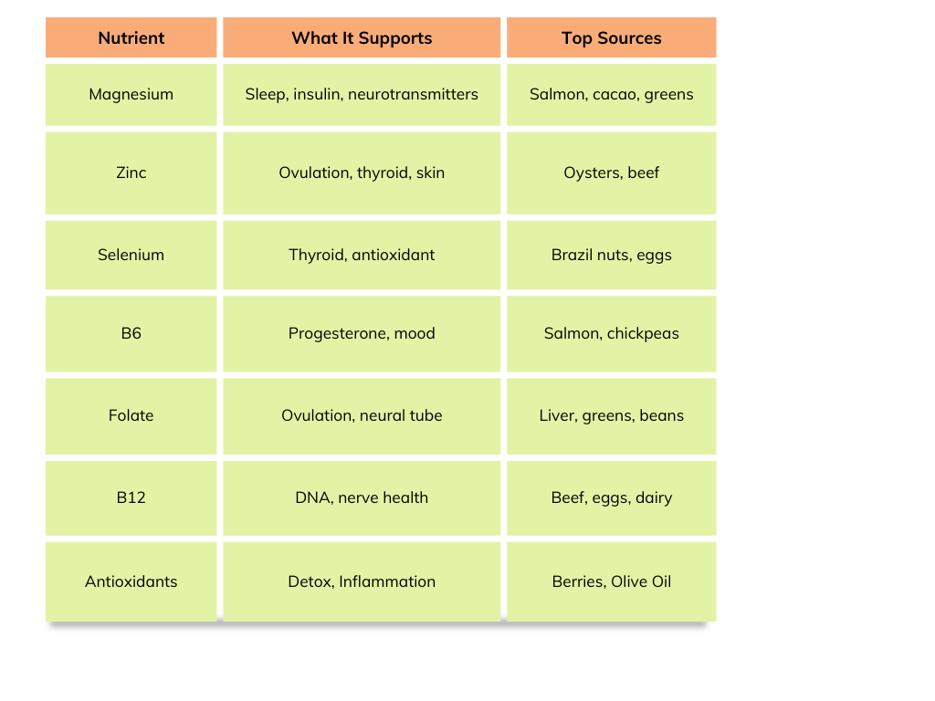 If you experience fatigue, cold intolerance, or very short luteal phases, supporting your thyroid with selenium, zinc, and iodine-rich foods may help. Adequate calories, stress management, and B6 also support healthy progesterone production.