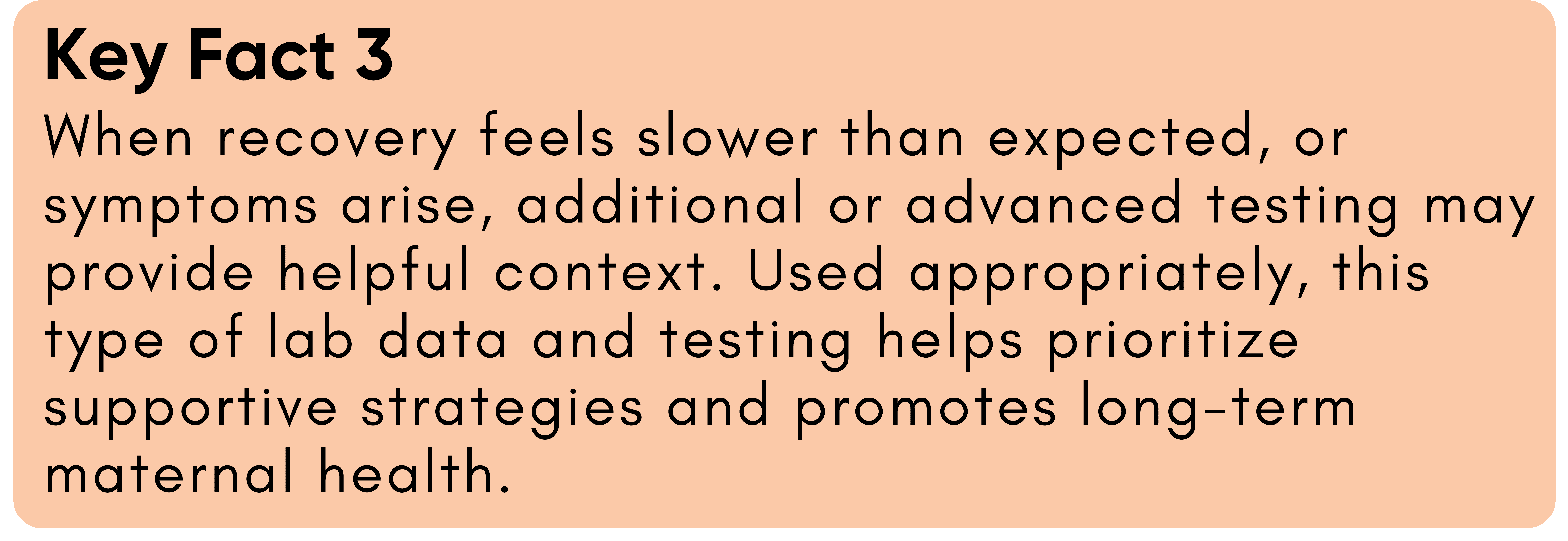 4. When recovery feels slower than expected, or symptoms arise, additional or advanced testing may provide helpful context. Used appropriately, this type of lab data and testing helps prioritize supportive strategies and promotes long-term maternal health.