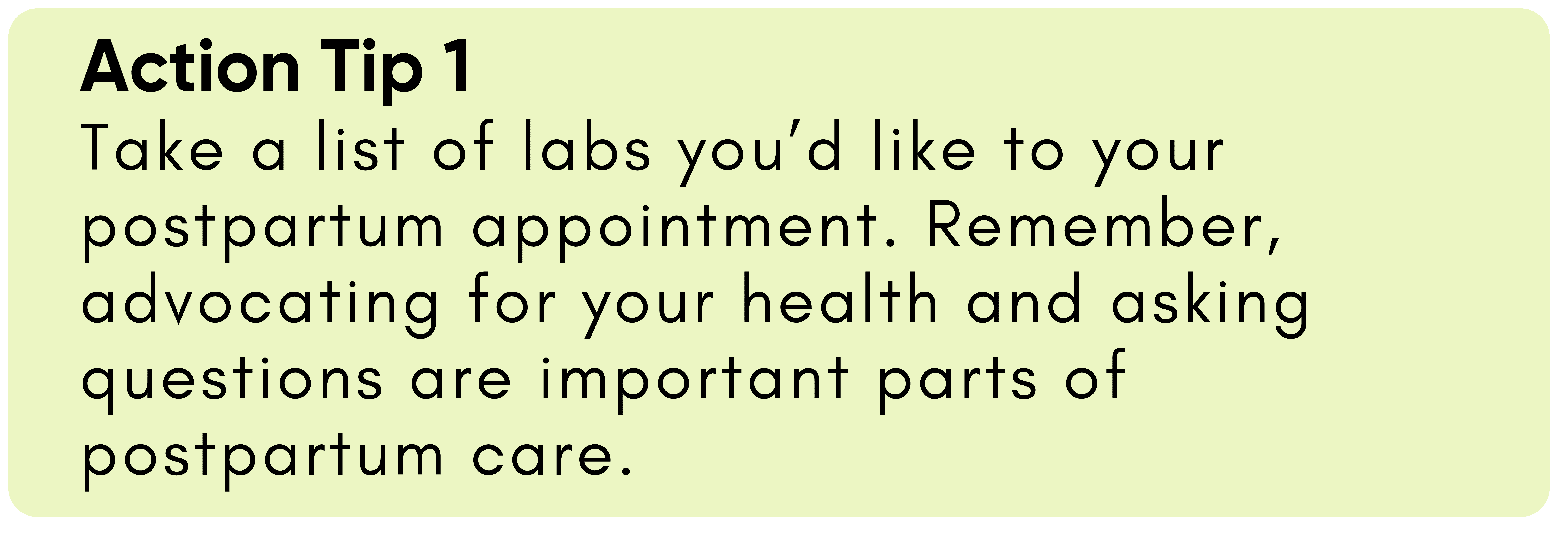 3. A CBC, iron panel, thyroid panel, vitamin D, vitamin B12 and folate, and blood sugar markers can help you understand how well your body is recovering, where you may need additional support, and how to support your energy and overall health postpartum best.
